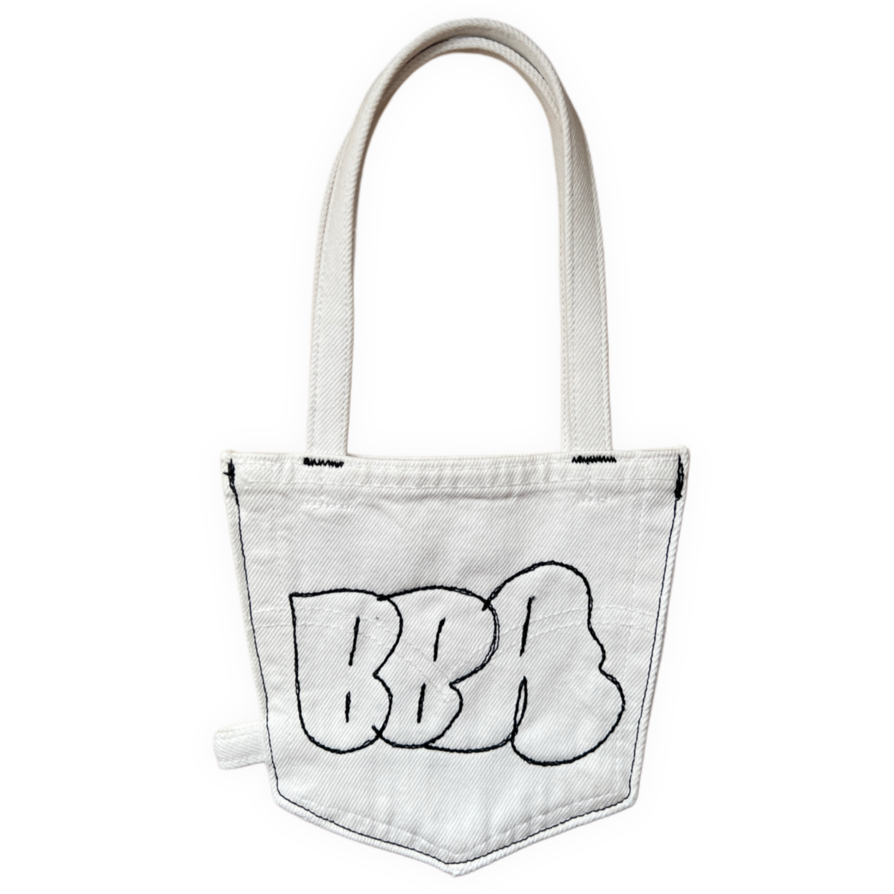 rescued and reworked denim back pockets in the form of a mini hand bag. Comes with a keychain ring and handles.